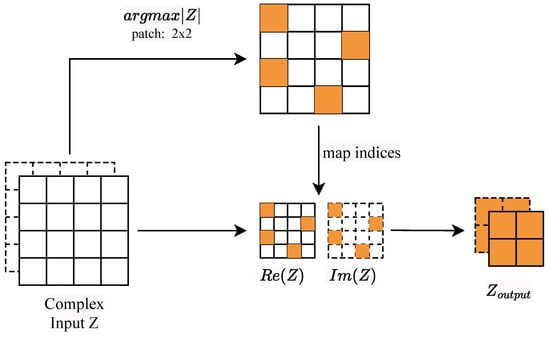 Usually, a pooling layer is used to reduce the spatial dimension of an input tensor across its features. The input is split into patches, and each patch is replaced by one value, which is defined by the pooling function. In max-pooling, the function is defined as the maximum value in the patch. Unfortunately, this could not be projected to the complex domain, where, in this work, the input tensor was defined as having real and imaginary components. The regular max-pooling layer’s output misplaces both real and imaginary components, resulting in the loss of the complex numbers (placing a real part in the same pool as a different imaginary part, or vice versa) and a consequent loss of phase information.