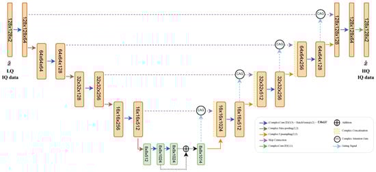 Block diagram of the proposed complex residual attention U-Net. is the low-quality (LQ) complex input and is the high-quality (HQ) reconstruction.