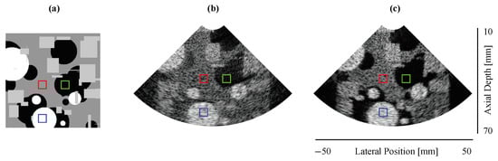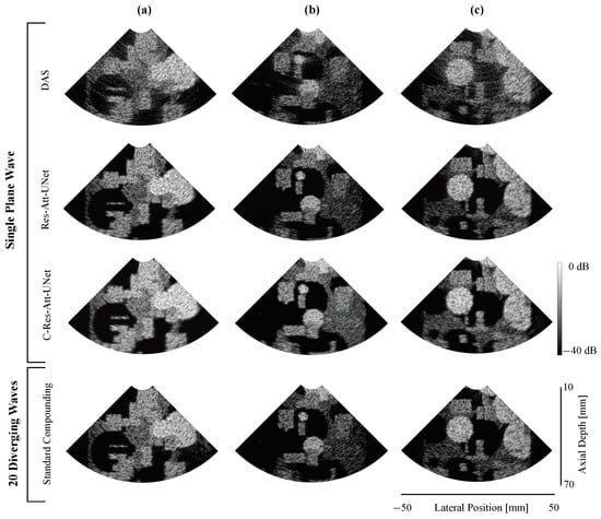 A phased-array image configuration based on a VERMON P2-8 transducer (VERMON SA, Tours, France) (number of elements: 80; center frequency: 2.8 MHz; element width: 200 μm; kerf: 40 μm) was used to simulate a training dataset, the open-source ultrasound simulator (SIMUS) [,], from computer-generated phantom images. The phantom images were constructed by randomly distributing sets of geometric shapes with varying dimensions and three levels of brightness over an image (Figure 4a). One phantom image is passed to SIMUS to generate the scatter points that are used for the US RF data simulation. Low-quality (LQ) input data were simulated using a single insonification acquisition (Figure 4b), whereas the high-quality (HQ) target data were obtained by coherently compounding 20 acquisitions that corresponded to the acquisition from steered angles between ±45° (Figure 4c). The acquired RF data were demodulated (via downmixing and low-pass filtering) and beamformed using DAS [], with a mean velocity of 1540 m/s over a grid image of pixels that corresponded to a depth of 60 mm (from 10 mm to 70 mm) and a sectorial angle of 90°. A total of 6000 phantom images were simulated to generate training pairs (LQ, HQ). We used the complex IQ data for the C-Res-att-UNet model and performed bmode conversion to obtain images for the Res-att-UNet model.