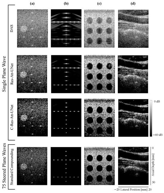 B-mode results of Res-Att-UNet and C-Res-Att-UNet with 1PW using the PICMUS dataset [] compared to DAS (1PW) and standard compounding (75 PWS). (a) In vitro CIRS phantom, (b,c) simulated, and (d) in vivo carotid longitudinal section.