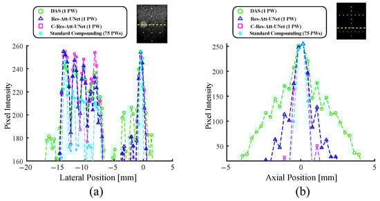 In addition to the quantitative evaluation, a lateral resolution analysis was conducted at different depths (26 mm and 33 mm) for in vitro and simulated point target scenarios. The lateral profiles illustrate that both Res-Att-UNet and C-Res-Att-UNet offer superior image reconstruction quality compared to single PW imaging. Notably, C-Res-Att-UNet demonstrated a high-quality reconstruction that was comparable to the target image, attributed to its complex attention mechanism and enhanced complex up-sampling layer.