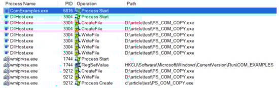 We use the well-known Sysinternals Procmon [44] as the application monitoring software for our experiment because it uses a minifilter driver and kernel notification routines similar to most anti-malware solutions. Procmon can see the actions of our basic malware when they are executed using Win32 API, as illustrated in Figure 1. For our COM implementation, the file copy operation is performed by a dllhost.exe. The Registry changes and the process creations are performed by two wmiprvse.exe processes, as illustrated in Figure 2. We explain why this happens later in the paper, but for the moment, we only note that the source (i.e., the process) of the recorded operations is hidden behind legitimate system processes. This essentially causes the spoofing attack; a security solution will see the system processes perform the operations, not the malware.