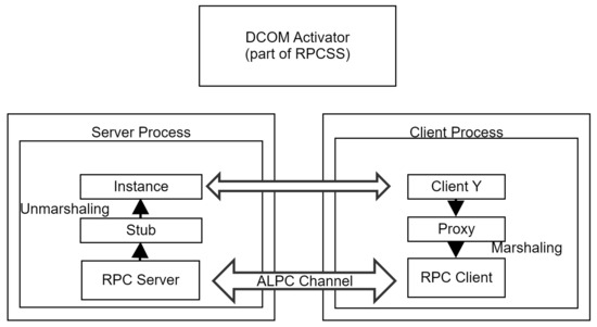 The Local Out-of-Process Server allows applications to use COM objects instantiated inside other processes on the same machine, as illustrated in Figure 4. The multi-process nature of this server implementation is hidden from the calling process through the use of a proxy [53] object (marshaler) on the client process, and a Stub [54] object (unmarshaler) on the server process. Communication is accomplished through the use of a named ALPC Channel [55].