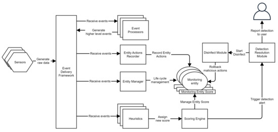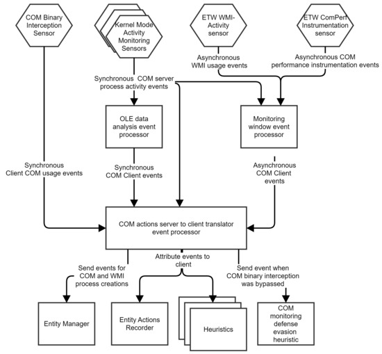 Hajmasan et al. [34] created a solution for detecting multi-process malware by changing the classic definition of process behavior to group behavior. Process groups are created and managed by an entity manager that analyzes process creations and code injections. The proposed solution uses various sensors that send information to an internal heuristic engine for malware detection. The heuristics assign a score to either a group or a process contained in it. Detection is triggered when a certain threshold for group or process score is reached. After detection, a remediation module is notified about malicious actions performed by a group and attempts to revert those actions. Our paper shows how this solution may be insufficient when dealing with COM, WMI and RPC via ALPC. We propose and build an extension of Hajmasan’s system that integrates COM, WMI and ALPC monitoring capabilities with the entity manager and the heuristic engine. Our improved system can detect more malware with a low performance impact.