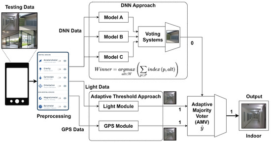 The Adaptive Majority Voter (AMV) mechanism consolidates the output of the DNN models, the light module, and the GPS module. It uses a weighted sum approach to combine these inputs, dynamically adjusting the weights based on the reliability and performance of each model and sensor data. This approach ensures that the most reliable predictions have a greater influence on the final decision, resulting in a robust and adaptive classification system. The adaptive weighting scheme allows the system to better handle variations in model performance due to changes in environmental conditions, thereby enhancing the robustness and accuracy of the classification process. By integrating and processing multiple signals, the DeepIOD framework significantly improves its ability to accurately classify indoor and outdoor environments. The combination of diverse sensory data mitigates the limitations of relying on a single type of data, enhancing overall accuracy. The adaptive majority voting mechanism further improves robustness by dynamically adjusting to prioritize the most reliable sources of predictions, ensuring high performance even under varying environmental conditions. In the following section, we will explain the components in more detail.