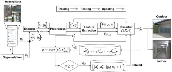 During the update procedure, the newly processed input is compared with the training dataset by calculating the correlation coefficient . If (where ), indicating a significant deviation from the existing training data, the DeepIOD system retrains the classifier on the updated training dataset , as shown in the Algorithm 1. Through these procedures, the DeepIOD system aims to achieve robust and accurate indoor–outdoor detection using IMU data, adapting to environmental changes and continuously improving its performance.