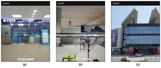 DeepIOD application experiment at three different locations: (a) night, indoor, Woori bank KAIST branch, in Daejeon, Republic of Korea; (b) night, indoor, Changzhou, China; and (c) day, outdoor, Lahore, Pakistan.