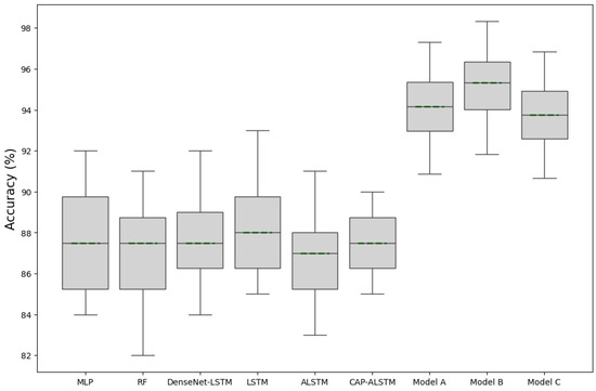 In Table 5, we present a comprehensive performance analysis of various indoor–outdoor detection methods evaluated in the CIOD public dataset. The comparison metrics include Accuracy, F1-Score, Precision, and Recall. SenseIO and IODetector, earlier methods from 2018 and 2012, respectively, show moderate performance, with accuracies of around 67.1% and 68.1%. The Random Forest (RF) method significantly improves these metrics, with an accuracy of 85.59%, reflecting advancements in machine learning approaches. Multi-Layer Perceptron (MLP) and Dense-LSTM models, further utilizing deep learning techniques, show enhanced performance, with accuracies of 86.98% and 88.05%, respectively. CAP-ALSTM, a more recent approach from 2022, achieves an accuracy of 89.36%, indicating the effectiveness of combining attention mechanisms with LSTM networks. The MB-SVM-HMM method, integrating Support Vector Machines and Hidden Markov Models, achieves the highest accuracy among related works at 92.17%. The proposed models (Model A, B, and C) outperform all related works, with Model B achieving the highest accuracy of 95.32%, followed by Model A at 94.17% and Model C at 93.76%. These results highlight the superior performance and robustness of the proposed models, particularly Model B, which excels in precision and recall as well, demonstrating the effectiveness of the new approaches in indoor–outdoor detection tasks; the superiority of our models is shown in Figure 7.