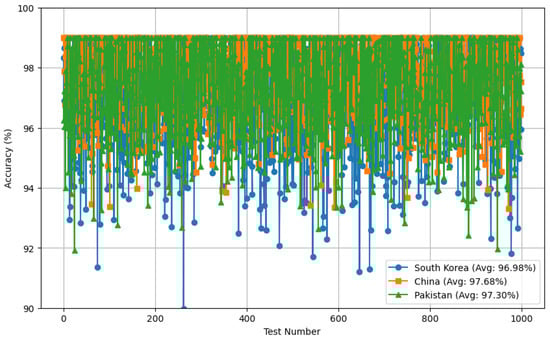 We present the accuracy of detecting indoor–outdoor transitions, as shown in Table 7 and shown in Figure 8 in three countries: Korea, China, and Pakistan. The results indicate the robustness and effectiveness of the context-aware detection method. In Korea, the accuracy of the detection of the transition between indoors and outdoors is 97.21%, with a standard deviation of ±2.23, showcasing high reliability and consistency. In China, the accuracy is slightly higher at 97.78%, with a lower standard deviation of ±1.52, indicating a more stable performance. In Pakistan, the detection accuracy is 96.97%, with a standard deviation of ±2.47, which, while slightly lower than Korea and China, still represents a very high level of accuracy. These results demonstrate the method’s capability of maintaining high accuracy across different environmental contexts and geographic locations, underscoring its generalizability and adaptability to various settings.