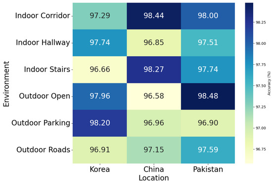 In addition, we performed a comprehensive evaluation of a context-awareness-based DeepIOD framework in different environment settings, as shown in Table 8 and shown in Figure 9, which provide an in-depth assessment of the DeepIOD app’s performance across various indoor and outdoor environments in Korea, China, and Pakistan. The evaluations are based on different sensor combinations, including IMU (Magnetometer, Accelerometer, and Gyroscope), light, and GNSS sensors. For indoor environments, the app demonstrated high accuracy in all settings. In the indoor corridor environment, China recorded the highest accuracy at 98.44%, with a standard deviation of ±1.45, followed by Pakistan at 98.00% (±2.09) and Korea at 97.29% (±1.73). In the indoor hallway setting, Korea led with 97.74% (±1.15), while China and Pakistan followed closely at 96.85% (±1.45) and 97.51% (±1.60), respectively. For indoor stairs, China again showed superior performance, with 98.27% (±2.44), with Korea and Pakistan achieving 96.66% (±1.78) and 97.74% (±1.27), respectively. In outdoor environments, the app also performed exceptionally well. For outdoor open spaces, Pakistan achieved the highest accuracy at 98.48% (±0.96), followed by Korea at 97.96% (±1.90) and China at 96.58% (±2.05). In outdoor parking areas, Korea led with 98.20% (±2.09), while China and Pakistan followed at 96.96% (±1.21) and 96.90% (±1.00), respectively. For outdoor roads, Pakistan again showed high performance at 97.59% (±2.49), with Korea at 96.91% (±2.77) and China at 97.15% (±2.80). The results indicate that the DeepIOD app consistently achieves high accuracy across diverse environments and geographic locations. The slightly higher performance in some settings suggests that certain environmental factors or sensor integrations may contribute to better detection capabilities in those areas. This comprehensive evaluation underscores the app’s robustness and adaptability in real-world applications.