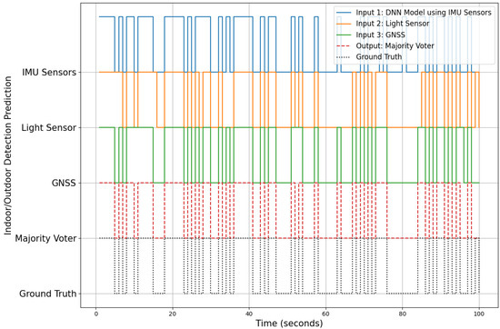 The comparison of the majority voter approach with the ground truth is demonstrated in Figure 10, which illustrates the performance of various input sensors, including IMU sensors, the light sensor, and GNSS, in detecting indoor and outdoor environments over time. The diagram features five rows, each representing a distinct aspect of the detection process. The top row (blue line) presents the predictions from the Deep Neural Network (DNN) models using IMU sensors, specifically the magnetometer, accelerometer, and gyroscope. The alternating high and low states of this line indicate transitions between indoor and outdoor environments. The second row (orange line) displays the predictions from the light sensor, which also fluctuate, capturing changes in lighting conditions associated with moving between indoor and outdoor spaces. The third row (green line) shows the predictions from the GNSS sensor, with transitions reflecting the sensor’s ability to detect outdoor environments, typically characterized by better GNSS signal reception. The fourth row (red dashed line) represents the output of the majority voter algorithm, which integrates the predictions from the IMU, light, and GNSS sensors. This majority voter output aims to provide a more accurate and robust detection by considering the input consensus. Finally, the bottom row (black dotted line) depicts the ground truth, representing the actual indoor–outdoor transitions during the test period. This is the benchmark against which the sensor predictions and the majority voter output are compared.