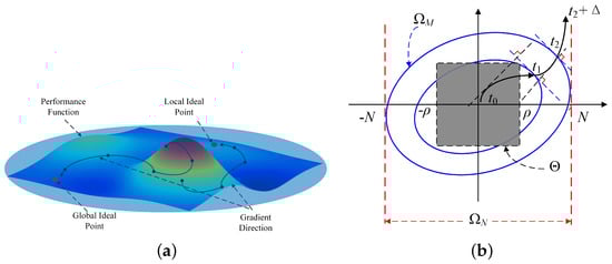 A sketch description of the predefined−time convergence of the steepest descent update rule. (a) The direction of the steepest descent update vector (The equipotential surface contour map represents the vector.); (b) a sketch of the predefined−time convergence.