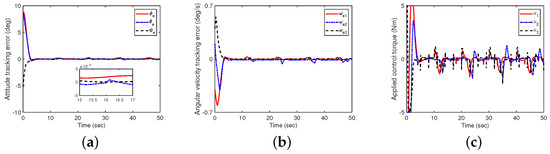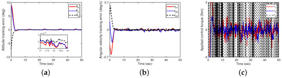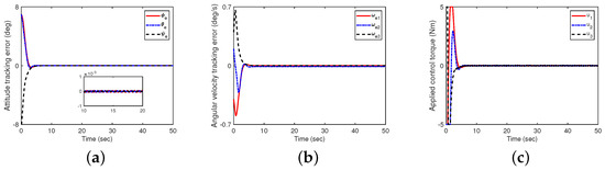 First, it is assumed that there are no disturbance and measurement noises (define this as Case A). In this case, the initial conditions of the system are and deg/s. The simulation results are shown in Figure 3. It can be observed that the attitude tracking errors of the spacecraft in Euler angles with a 3−1−2 rotation sequence (i.e., , and ) are less than 0.002 degrees when , which indicates that the proposed control scheme in this paper can achieve perfect spacecraft attitude tracking.