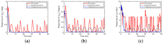 As shown in Figure 6, even with simultaneous uncertain factors and measurement noise affecting the spacecraft system, the proposed predefined-time dynamic predictive method exhibits superior performance in terms of spacecraft attitude angle tracking, angular velocity response, and control torque jitter compared to both PID and fixed-time controllers. The PID controller shows significant performance degradation under uncertainties and disturbances. The fixed-time controller offers improvements but still lacks the flexibility and robustness of the proposed method.