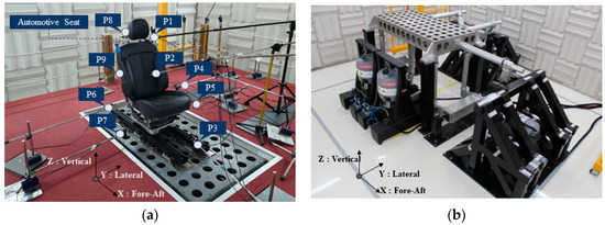 BSR measurements and Loudness N10 calculations were performed based on GMW 14011, as illustrated in Figure 2 [19]. The BSR data were extracted from positions 150 mm away from each point on the car seat, as shown in Figure 2a, in accordance with GMW 14011. A multi-axis silent shaker was used, as depicted in Figure 2b. The background noise of the anechoic chamber was within 30 dB(A) under the operating conditions of the shaker, and the environmental chamber allowed for temperature control from −40 °C to 50 °C. The experimental conditions of the configured dataset were measured at low temperature (−20 ± 5 °C), room temperature (23 ± 5 °C), and high temperature (50 ± 5 °C).