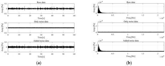 Characteristics of added noise in raw data: (a) time domain; (b) frequency domain.