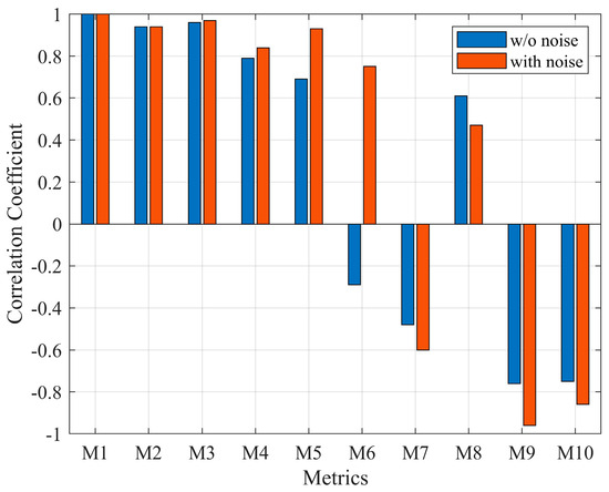 Since the results of the covariance analysis define the relationship based on the level of the variables, they were expressed based on the normalized physical quantities. As shown in the covariance analysis results, each physical quantity exhibits a correlation with each other. Similar to the normalized data analysis results, the covariance analysis results indicate a correlation of approximately 0.07 between the magnitude-based quantities M2 and M3 and the physical quantities corresponding to frequency characteristics M4, M5, and M6. Considering vocal aspects, BSR noise is an unclear signal, suggesting that voice-related metrics may exhibit a high negative correlation. Since covariance does not include the degree of the relationship (the degree of the relationship according to the level of two variables), the relationship between the two variables was analyzed through correlation analysis. However, the previous covariance analysis was performed based on normalization to minimize the error in the deviation of levels. Therefore, it can be predicted that the correlation analysis results will exhibit similar characteristics to the normalized covariance analysis results. The results are listed in Table 3.