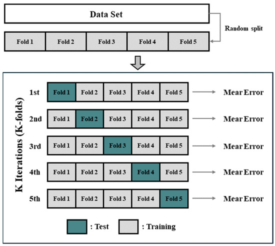 K-fold cross-validation is a method that evaluates a model by randomly partitioning the dataset into k sub-groups. It uses one of the sub-groups as the test data and the remaining k-1 sub-groups as the training data. This was repeated k times. The model is evaluated based on the average prediction error derived from each iteration. Typically, five or ten is used as the value of k to balance (Trade-off) the bias and variance of the regression model [20]. In general regression models, overfitting may occur, which only reflects biased characteristics. The K-fold cross-validation method can prevent this issue by randomly partitioning the dataset into training and test data and building and evaluating the model k times. Since BSR signals are collected during the final stage of the process, it is impractical to obtain a large amount of data. K-fold cross-validation is a representative method that leverages all data for both training and testing, thereby enabling the creation of a more generalized model and effective detection of overfitting and underfitting. Consequently, to address the issue of limited data, we employed K-fold cross-validation in this study, as illustrated in Figure 5.