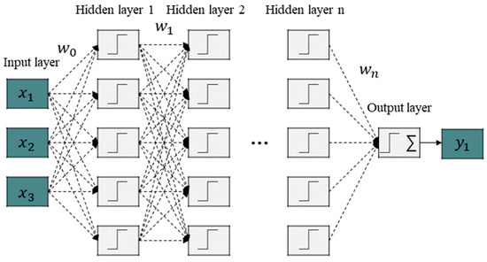 Since deep learning is performed based on data, a substantial amount of data is generally required to improve accuracy. Accuracy typically improves with the increase in network depth, and an optimized model can be constructed through careful tuning of hyperparameters. A DNN, also known as a feedforward neural network or a multi-layer perceptron, is a neural network that has two or more hidden layers [23,24,25]. As illustrated in Figure 6, the DNN described in the example has three input dimensions and five neurons in the hidden layers. The output of the hidden layers is expressed as follows: