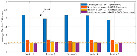 Compared to methods that incorporated the linear and nonlinear regression equations along with the hold-out method, the DNN that utilized K-fold cross-validation predicted results that were closer to the actual values. The absolute errors of all results are shown in Figure 11.