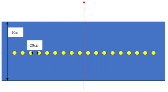 The experimental site was an empty area measuring 10 m in length and 20 m in width. Filter paper clips were affixed to the experimental rack at 20 cm intervals using long-tail clips, as illustrated in Figure 2. The red arrow direction within Figure 2 indicates the flight path of the UAV during operation, while the yellow circles denote the positions where filter paper was placed. This type of drone has a spraying swath of 4 m and 18 sampling points arranged with filter paper at intervals of 20 cm (without sampling at both ends). The on-site sampling layout is shown in Figure 3. The rationale for arranging sampling filter paper vertically along the flight path of the plant protection UAV is primarily based on the distribution characteristics of droplet deposition. While the amount of droplet deposition along the parallel direction of flight lines tends to be relatively uniform or similar, significant variations are observed in deposition across the perpendicular direction. This distinct distribution pattern is crucial for understanding how different operational parameters influence the uniformity of the deposition rate. By deploying the sampling papers vertically, this study aimed to capture these variations in deposition across the vertical profile of the sprayed area. This method allows for a detailed assessment of how changes in parameters such as the nozzle flow rate, flight speed, and flight height impact the evenness of the spray deposition.