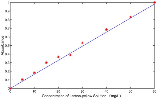 After obtaining the standard solution and its absorbance value, the ‘Polyfit’ function in Matlab was used to conduct linear fitting on the above data. Since the absorbance value of the lemon-yellow solution is directly proportional to its concentration, linear fitting is applicable in this case. By using the above data, a concentration–absorbance curve for the lemon-yellow solution, as depicted in Figure 4, was derived through linear fitting.