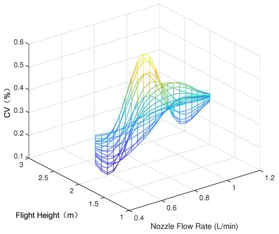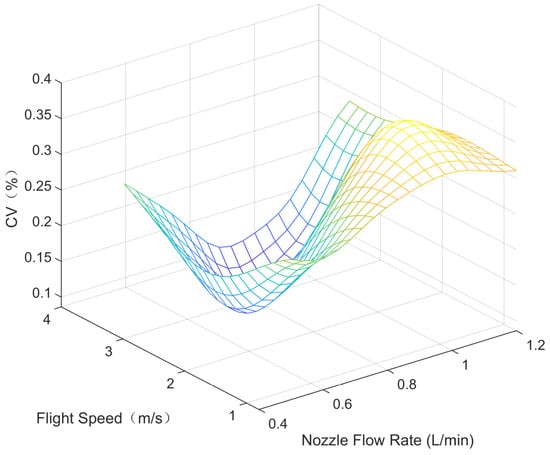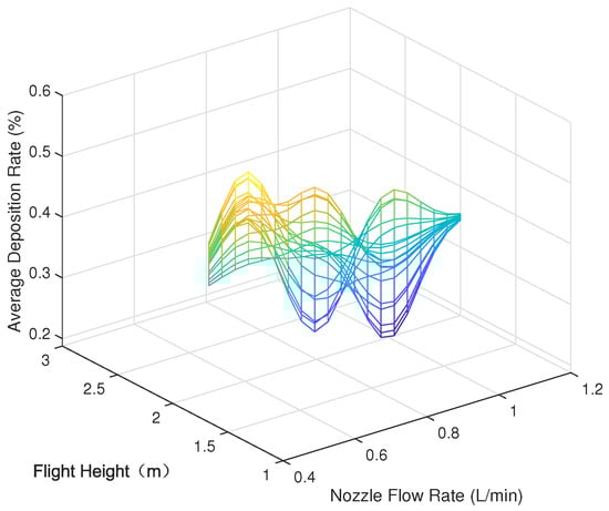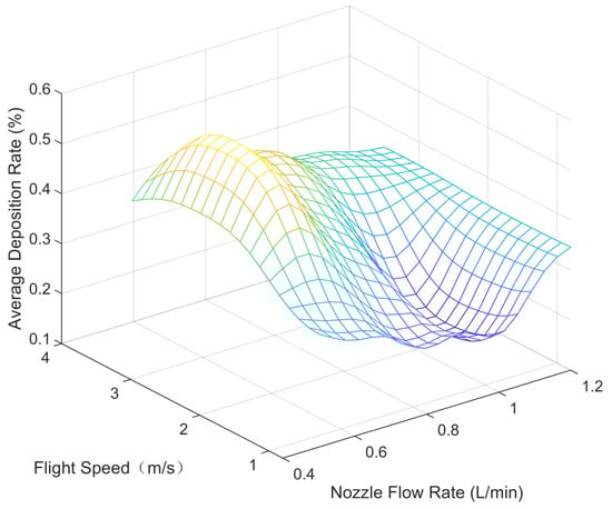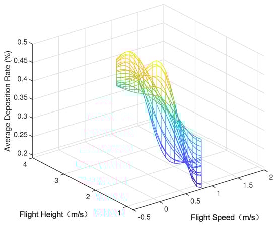 Parametric modeling was conducted using the experimental data outlined in Section 3, depicting the parameter space between each variable (nozzle flow rate, flight speed, and flight height) and the modeled average deposition rate and uniformity (coefficient of variation), as shown in Figure 5, Figure 6, Figure 7, Figure 8, Figure 9 and Figure 10.