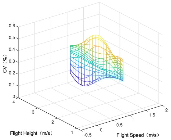 In order to demonstrate the uniformity of the deposition rate at each sampling point under different operational parameters of the plant protection UAV, this paper uses CV as the uniformity measure of the deposition rate at each sampling point under different parameters. The calculation method of the coefficient of variation, CV, is