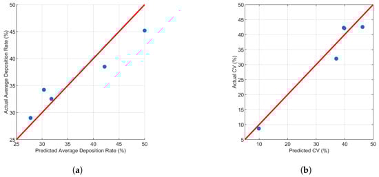 Comparison of predicted values and actual values. (a) Average deposition rate. (b) CV.