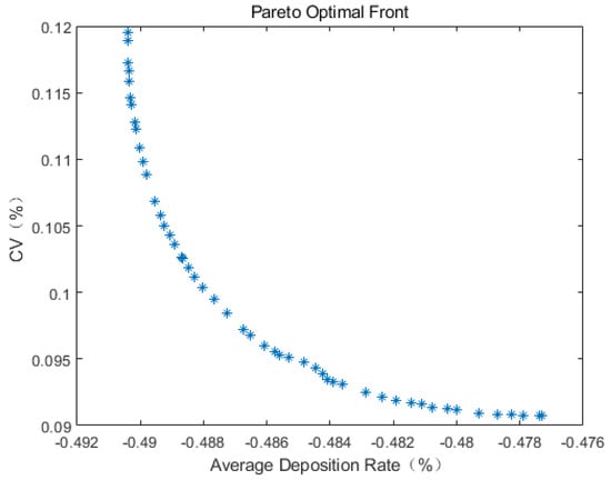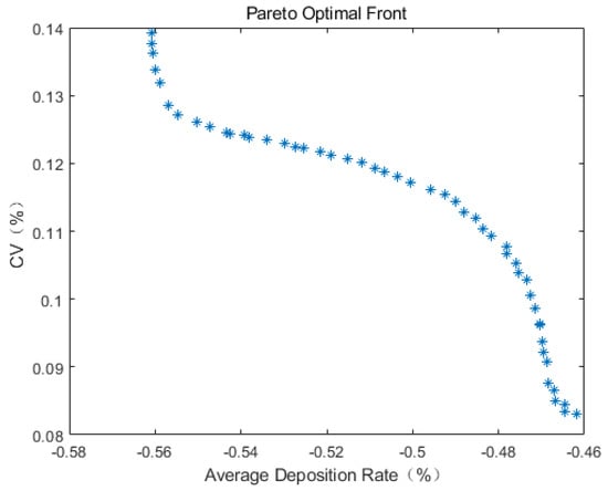 The multi-objective genetic algorithm employed in this study is aimed at minimization, with the objectives being the maximum average deposition rate and the minimum coefficient of variation. Therefore, after obtaining the predicted objective function values (average deposition rate and CV), the predicted average deposition rate is transformed to its opposite value before non-dominated sorting. Thus, the average deposition rate shown in the figure represents the opposite value of the actual average deposition rate.