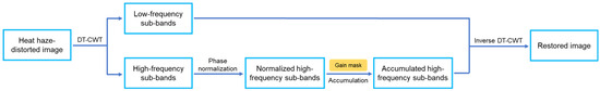 Previous studies [16,19] have used DT-CWT to mitigate heat haze in images. A sequence of heat haze-distorted images is analyzed through a region-based process to restore one single image. Hence, these methods cannot achieve real-time processing. This study proposes a pixel-based method that only requires the target image itself for it to be restored. The region-based method segments the image into regions and processes each region separately, and the fusion strategy is more complex. In contrast, the pixel-based method directly combines pixel values with a simpler averaging operation. Therefore, the pixel-based method can achieve faster processing. The detailed mitigation process is as follows: for a heat haze-distorted image, DT-CWT is performed iteratively on it to obtain high-frequency and low-frequency sub-bands. In this paper, the number of iterations of DT-CWT is denoted as level, which is a significant influence parameter, and the impact of its different values on the experimental results will be discussed in Section 3.6. During the iteration process, the low-frequency sub-bands are preserved intact, while the high-frequency sub-bands undergo a phase normalization process. Then the weighted sum of high-frequency sub-bands is calculated through gain masks. Finally, the inverse DT-CWT is performed to reconstruct the processed image. Figure 2 shows the flowchart of the mitigation process.