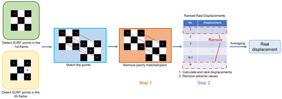 In the proposed method, a two-step refining process is developed to eliminate mismatched points. In Step 1, the matched point pairs are sorted according to the sum of the absolute difference (SAD) of the feature vectors. A subset with the smallest SADs (best-matched points) is chosen to calculate the overall displacement. After that, the displacements between each selected point pair are determined and indicated as the raw displacements. In Step 2, an extremum removal mechanism is implemented. The raw displacements are ranked, and portions with the highest and lowest values are removed. Finally, the real displacement is obtained by calculating the mean of the remaining displacements. The percentage of removal is referred to as the removal threshold in the rest of the paper. If the removal threshold is set to 10%, it means that the largest 10% and smallest 10% of all raw displacements will be removed. Figure 3 shows the processes of displacement extraction and refinement.