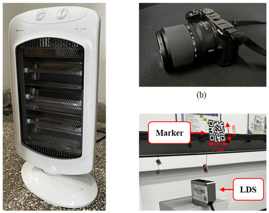 In the experiments, the heat haze is created by a household electric furnace, as shown in Figure 5a. The furnace is placed between the model bridge and the camera in the light path so that images captured by the camera are distorted by heat haze. The LDS is fixed on a stationary platform right under the marker to ensure that it accurately collects the marker’s displacements. The setup of the experiments is shown in Figure 6.