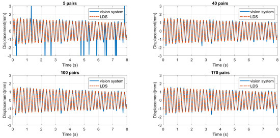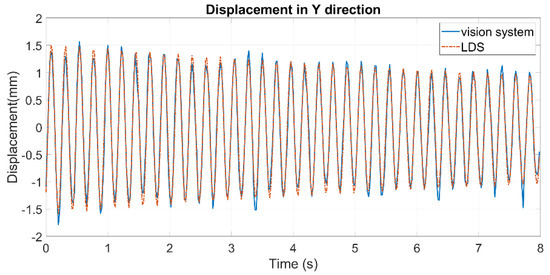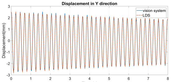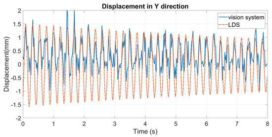 An eight-second sample is used for comparison. The results are shown in Figure 8. It can be seen that, despite a few discrepancies near the peaks of the curve, the displacements extracted by the vision system match well with those extracted by the LDS.