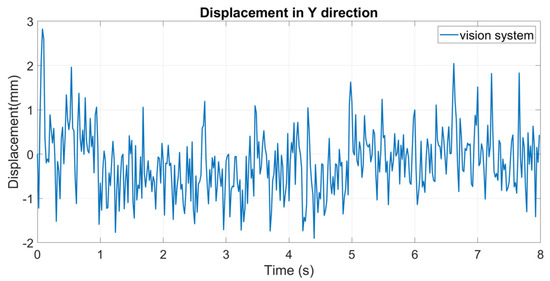 An eight-second sample is selected for analysis. The result is shown in Figure 9 (RMSE = 0.7564 mm). As can be seen clearly, the displacements extracted by the vision system are seriously distorted by heat haze. Random fluctuations occur in the displacement curve, which proves that the distortion caused by heat haze is a temporal variant.