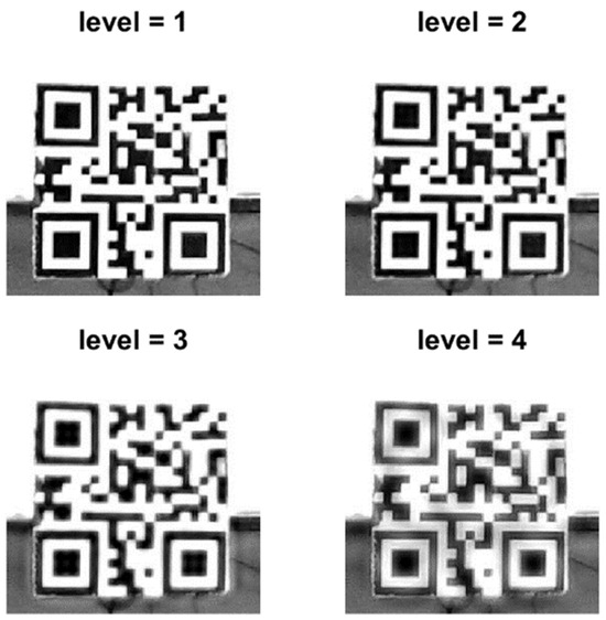 After experimental validation of the proposed method, the values of different parameters in the method are adjusted to achieve the best mitigation result. Different levels (levels = 1, 2, 3, and 4) of DT-CWT are performed, and the correction rate is calculated along with the processing time for each condition. The best 50 pairs of matched points are used to calculate the displacement, and the removal threshold is 10%. Figure 14 shows the ROI images after different levels of DT-CWT. Table 3 shows the error, average processing time of an image, and correction rate at each level.