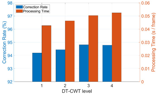 Figure 15 shows the influences of different DT-CWT levels on the mitigation effect. As the level increases, it takes more time to process a single image, and the correction rate rises as well. Generally, the processing time remains less than 0.06 s per frame, allowing for real-time computation if more powerful CPUs are available and the sampling rate is lower. Therefore, this experiment proves the possibility of real-time monitoring using the proposed method.