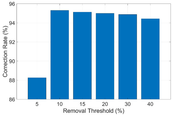 Finally, the impact of the removal threshold is examined. The removal threshold mechanism eliminates a certain portion of point pairs with the highest and lowest displacements, assuming that they are mismatched. If the removal threshold is set to 10%, it means that the pairs with the highest and lowest 10% displacements are excluded from the mean displacement calculation. The best 100 pairs of matched points are used with different removal thresholds, and a similar comparison is carried out. The results are shown in Table 5. Figure 18 shows how the correction rate changes with different removal thresholds. To take a closer look at the results, it can be found that a removal threshold of 10% can produce the most accurate displacements (the correction rate is 95.31%). The reason for this is similar to that explained before. When the threshold is too low, mismatches still exist; when it is too high, the averaging effect is weakened.