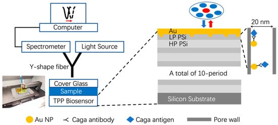 The PSi TPP biosensor structure and its optical measurement configuration. The Au NPs embedded in the first LP PSi layer means that Au NP can infiltrate into the nanopores of porous silicon. The picture on the bottom left shows the setup of the 12 × 8 biosensor array and its sequential measurement by an in-house developed equipment mainly consisting of a two-dimensional moving stage to carry and position the sensor array and a fiber spectrometer to take the optical measurement.