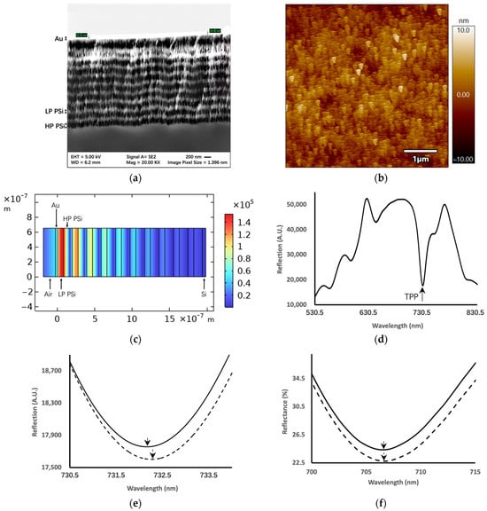 (a) Cross-sectional scanning electron microscopy image of the TPP biosensor structure. The periodic layered structure of the porous silicon DBR is clearly visible. The gold thin film is the bright layer on top of the porous silicon DBR with the thickness not to scale due to a focusing issue; (b) atomic force microscopy image of a Au thin film surface morphology, showing the nanoporous structure of Au due to conformal deposition onto porous silicon; (c) Color map of electrical field strength distribution profile of TPP biosensor simulated by COMSOL V5.5. The field peak resides in the first (or top) PSi layer close to the thin metal film. Light is incident from the left side of the TPP device in air with a power of 1 W/m; (d) An example of the reflection spectrum of the TPP device is that of where the resonant state manifests as the reflection minimum at a wavelength of around 730 nm; (e) Example of the redshift of the TPP resonance wavelength upon the specific biomolecular binding of 3 ng/mL CagA antigen with the CagA antibody immobilized on the biosensor surface beforehand. The spectrum of the TPP biosensor both before (solid curve) and after (dashed curve) binding is shown. The redshift of the resonance minimum, indicated as arrows, is around 360 pm. (f) Example TPP resonance spectra upon exposure to PBS buffer with CagA antibody immobilized on the biosensor surface beforehand. The spectrum of the TPP biosensor both before (solid curve) and after (dashed curve) PBS is shown. The shift of resonance minimum, indicated as arrows, is 0 pm.