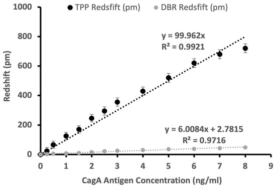 To characterize the response of the PSi TPP biosensor, different concentrations of CagA antigen were detected with the PSi TPP biosensor. The redshift vs. antigen concentration can be plotted and the data can be fitted with the linear trend. Figure 3 shows the response curve of the PSi TPP biosensor for detecting the varying concentrations of the CagA antigen. At each CagA concentration, five detection experiments were conducted with each experiment using a different biosensor. As a result, a total of sixty biosensors were used to obtain the data in Figure 3. A high-quality linear fitting is also given to match the data points at different concentrations. The sensitivity of the PSi TPP biosensor can be defined as: