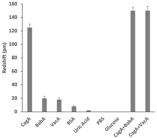 For the specificity test of the PSi TPP biosensor, BabA antigen, VacA antigen, BSA (bovine serum albumin), uric acid, PBS buffer, as well as glucose, were used as nonspecific targets of detection. For the introduction of interference, all the nonspecific species have concentrations of 5 ng/mL, and the CagA antigen has a concentration of 1 ng/mL. Figure 4 shows the comparison of the specific response signal (the redshift for CagA antigen) with the nonspecific response signal (the redshift for other targets). The specific response signal is at least six times stronger than the nonspecific response signal in terms of redshift amplitude. This demonstrates the good specificity of the PSi TPP biosensor in the aim of detecting the CagA antigen of H. pylori. In addition, to further determine the specific recognition of H. pylori, a competitive test was also carried out wherein two specimens consisting of 1 ng/mL CagA mixed with 5 ng/mL BabA and 5 ng/mL VacA, respectively, were used for detection. The response signal level of the competitive test is also included in Figure 4 for comparison. It can be observed that, under high dose interference, the PSi TPP biosensor can successfully recognize the CagA antigen.