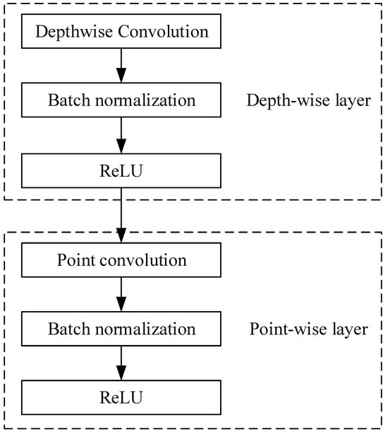 The MobileNet network [] is a lightweight architecture that embraces depthwise separable convolutions (DSC) instead of conventional convolutions. This innovative approach not only maintains model accuracy but also markedly diminishes the number of parameters and computational requirements. As a result, the reliance on hardware computing resources is substantially reduced. MobileNet is currently recognized as an efficient and lightweight architecture, particularly well-suited for embedded devices with limited computing resources.