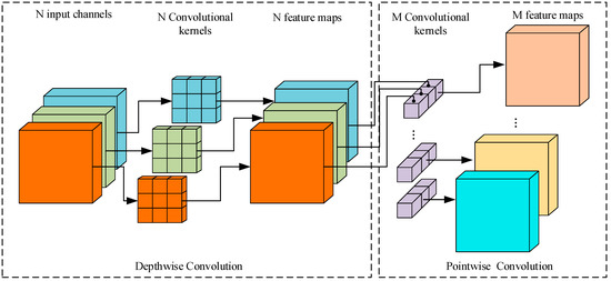 As shown in Figure 1 and Figure 2, the depth separation convolution is divided into depthwise convolution (DW) and pointwise convolution. Depthwise convolution only has a one-dimensional convolution kernel, which is not extended after completing the convolution. To be specified, let us assume that the input channels and output channels are represented by M and N, respectively. The kernel size is  and the input map size is . The cost of  is considered as follows:
