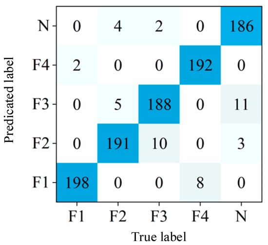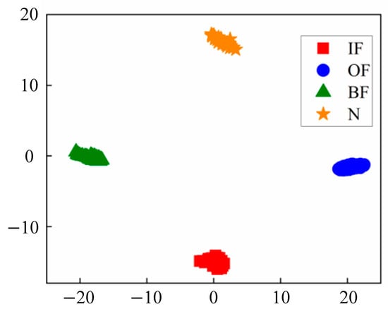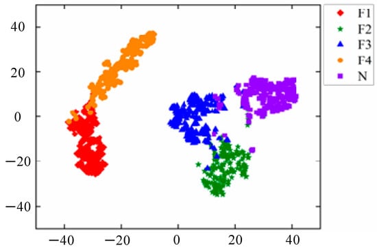 The t-distribution random neighborhood embedding t-SNE is used to reduce the dimensionality and visually evaluate the quality of the learned high-dimensional features. The proposed method’s feature clustering visualization results after the t-SNE dimensionality reduction are shown in Figure 9. From the figure, it can be seen that only a small number of samples are misclassified, and the model’s feature clustering effect is good, with only F3 faults overlapping more with N and F2 faults.