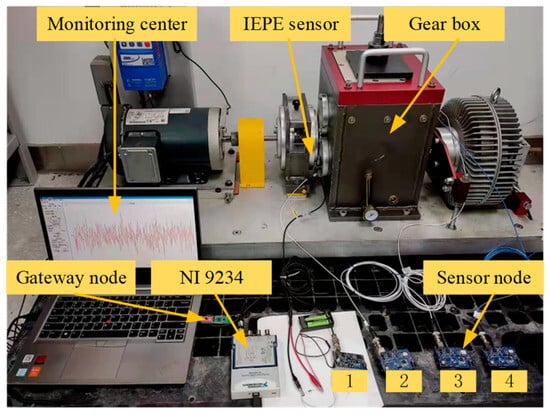 In contrast to conventional wired acquisition systems, mechanical vibration wireless sensor networks (MvWSNs) are a self-organizing distributed system coupled with the capacity for on-chip processing, which is a near-sensing monitoring system [,,]. This unique characteristic allows them to be seamlessly deployed in rotating and sealed environments for efficient data collection without posing risks to the monitoring equipment, such as those found in wind power gearboxes.