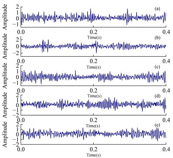 Vibration signals in different conditions from MvWSNs sensor node: (a) Normal; (b) Tooth surface pitting fault of gear; (c) Tooth root crack fault of gear; (d) Outer fault of bearing; (e) Inner fault of bearing.