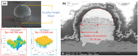 Characterization of the Cu pillar. (a) Roughness of the Cu pillar top and substrate. (b) Radius of curvature of the Cu pillar.