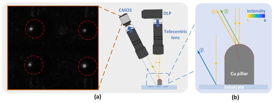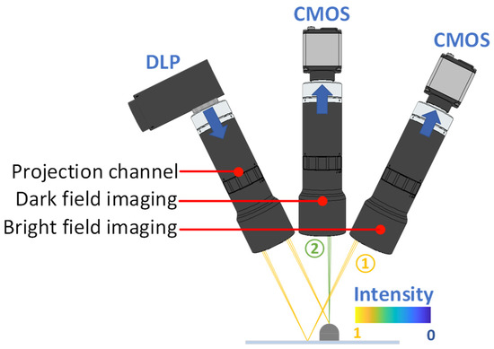 Dark-field scattering imaging has been extensively studied in microscopy and has successfully achieved 3D imaging for small structures [19,20,21]. Dark-field imaging effectively captures weakly scattered light signals from a structure with large curvature. Drawing inspiration from dark-field confocal microscopy, we introduce the dark-field imaging strategy into the MFPP system. Figure 4 illustrates the concept of a hybrid bright-dark-field MFPP system. As shown in Figure 4, with the oblique projection condition, the bright-field imaging channel captures specular reflection signals from the substrate, and the dark-field channel captures scattering signals from the top region of the Cu pillar. Ideally, maintaining constant illumination intensity while independently adjusting exposure times in the two imaging channels allows for sufficient light signal capture from both the top region of the Cu pillar (beam-2 in Figure 4) and the substrate (beam-1 in Figure 4). Subsequently, the height of the Cu pillar can be extracted by fusing the 3D point clouds from the two imaging channels.