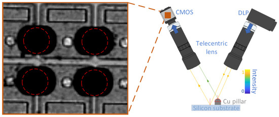 Cu pillars are physical interconnect structures utilized in wafer-level 3D chip stacking. The uniform height of copper pillars ensures chip yield [1], necessitating measurement of all Cu pillars on wafers in the semiconductor industry [2,3]. Traditional optical sensing techniques such as white-light interferometry [4,5,6], confocal microscopy [7,8], and white-light triangulation [9,10] are used in Cu pillar measurement. However, their inherent limitations in measurement speed pose challenges in achieving the required throughput for wafer inspection and metrology in industry, especially in on-line measurement. Hence, exploring alternative optical measurement techniques with superior throughput is essential.